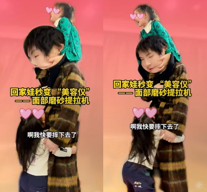 下圖里,向佐將二胎兒子扛在肩膀上,大女兒則用手抱著,老父親真是累并快樂著啊,哈哈哈。不僅如此,二寶在爸爸肩膀上坐著的時候,還不停地捏爸爸的臉蛋兒,向佐的臉都被自家寶貝兒子給捏變形了,看著可真是太喜感了。