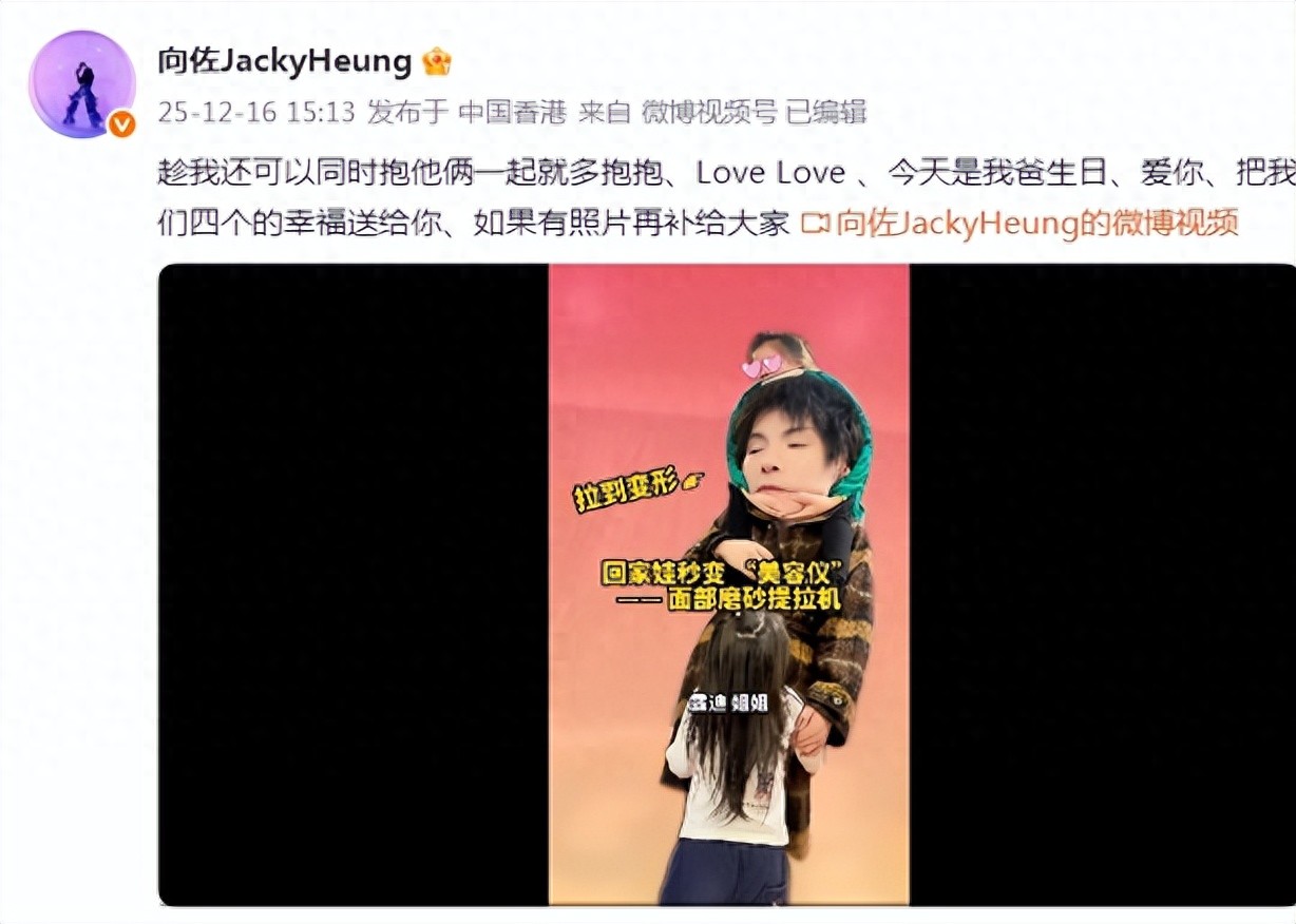 12月16日,演員向佐在個人社交平臺分享了一段與老婆郭碧婷以及一雙兒女的溫馨日常,他還發文:“趁我還可以同時抱他們倆一起就多抱抱”,看得出來,向佐是真的超級寵愛孩子們呀,父子父女三人互動真是太有愛了。與此同時,向佐也透露這天是他爸爸的生日,并稱將一家四口的幸福全部送給爸爸,字字句句都表達出了對爸爸的愛,好感人。