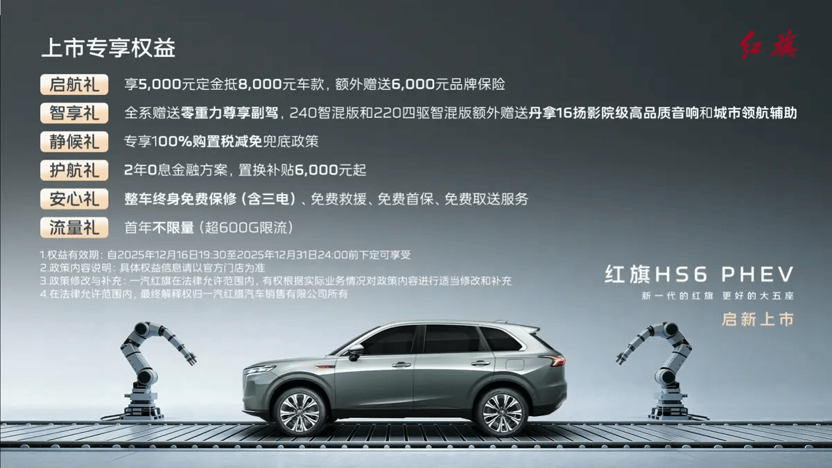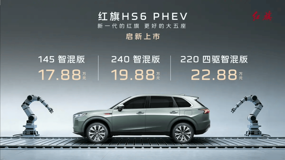 2025年12月16日,紅旗HS6 PHEV正式上市發布,共推出3款車型,售價區間為17.88-22.88萬元。 同時,官方推出啟航禮、智享禮、靜候禮、護航禮、安心禮、流量禮。新車定位為中大型SUV,是紅旗“鴻鵠”混動平臺的全新車型,搭載1.5T插混動力系統,最大純電續航248km,綜合續航1650km。新車采用紅旗品牌家族化的設計,配置上擁有中控雙聯屏、車載冰箱、零重力座椅等。