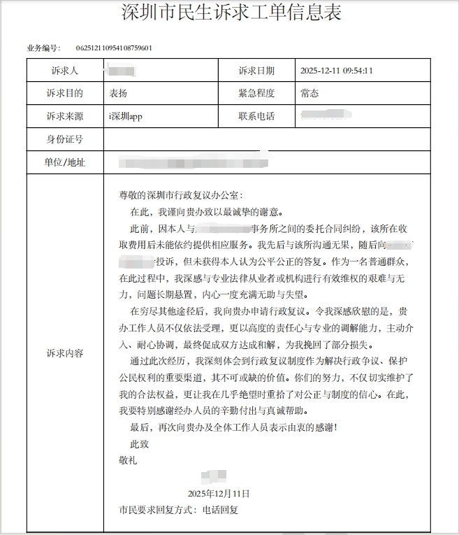 12月11日,深圳市人民政府行政復議辦公室收到了一封12345平臺轉來的“民生訴求”。行政復議作為一項和老百姓打交道的工作,群眾“民告官”的平臺,難免會收到市民群眾通過12345平臺轉來的各種訴求。所以當工作人員正準備點開這封“群眾來信”,按照流程轉給相關同事按信訪流程辦理時,一看信件,忍不住歡呼起來:“是表揚信!”