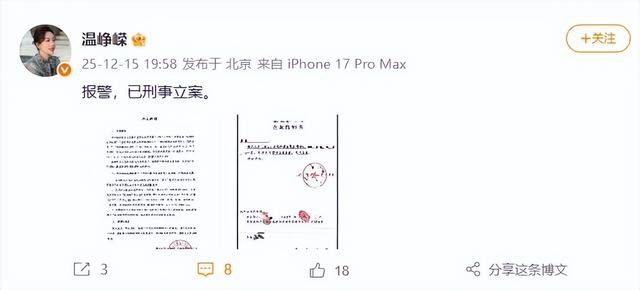 12月15日,溫崢嶸在社交平臺發文稱:報警,已刑事立案。