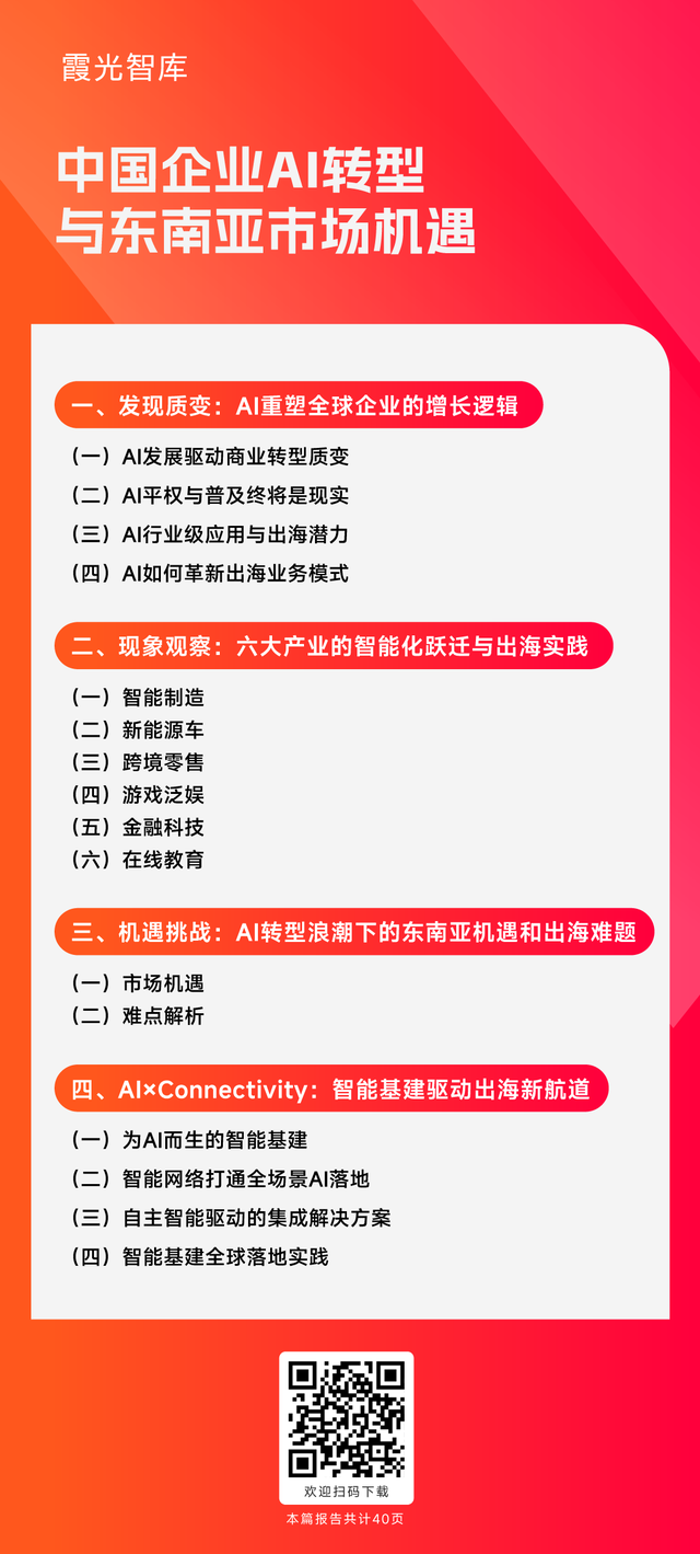 報告指出,中國AI發展已跨越從模型研發到商業落地的關鍵階段,國產大模型成本快速下降、應用場景持續深化,為企業出海提供了普惠性的智能能力。在“智能化躍遷”的進程中,以智能制造、新能源汽車、跨境電商、游戲泛娛、金融科技、在線教育為代表的六大產業,正通過AI深度賦能,已在全球市場展現出顯著的競爭力和模式創新性。