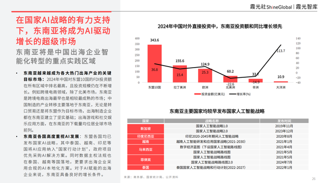 東盟各國均已發布國家AI戰略,其中泰國、越南、印尼等國將AI應用納入"國家行動計劃",政府項目優先采購AI解決方案。同時數據主權法規也在泰國、越南等國落地,更要求出海企業采用合規的AI本地化方案。對于AI賦能的出海企業來說,東南亞具備良好的增長條件。