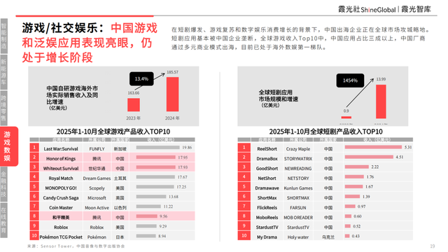 在短劇爆發、游戲復蘇和數字娛樂消費增長的背景下,中國出海企業正在全球市場攻城略地。短劇應用基本被中國企業壟斷,全球游戲收入Top10中,中國應用占比三成以上,中國廠商通過多元商業模式出海,目前已處于海外數娛第一梯隊。
