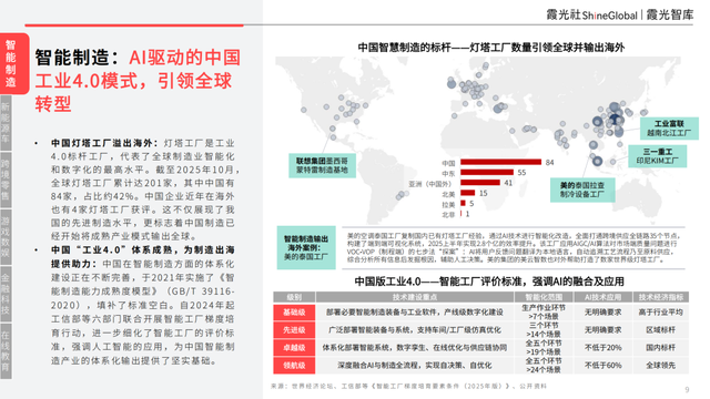 燈塔工廠是工業4.0標桿工廠,代表了全球制造業智能化和數字化的最高水平。截至2025年10月,全球燈塔工廠累計數量達201家,其中中國有84家,占比約為42%。中國企業近年在海外也有4家燈塔工廠獲評。這不僅展現了我國的先進制造水平,更標志著中國制造已經開始將成熟產業模式輸出全球。