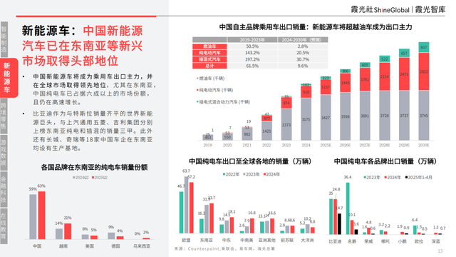 中國新能源車將成為乘用車出口主力,并在全球市場取得領先地位,尤其在東南亞,中國純電車已占據六成以上的市場份額,且仍在高速增長。