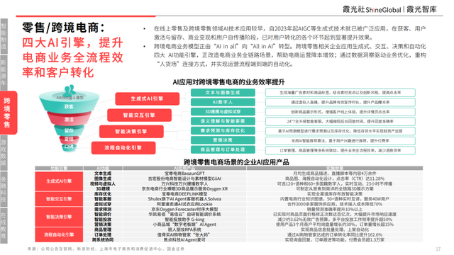 在線上零售及跨境零售領域AI技術應用較早,自2023年起AIGC等生成式技術就已被廣泛應用,在獲客、用戶激活與留存、商業變現和用戶自傳播階段,已對用戶轉化的各個環節起到顯著提升效果。
