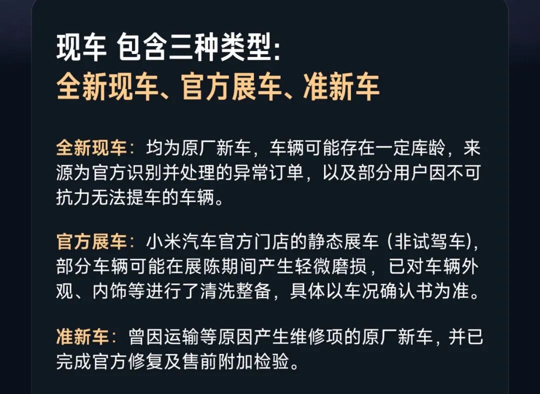 官方說現(xiàn)車來源包括:全新現(xiàn)車、官方展車、準(zhǔn)新車。