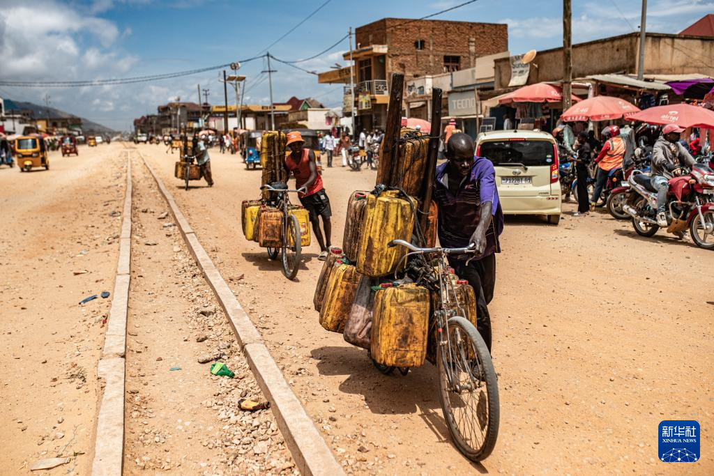 12月15日,在剛果(金)東部城市烏維拉,當地居民用自行車搬運汽油。