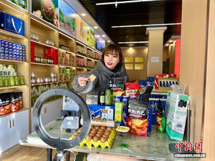2025年12月,甘肅隴南市武都區,電商從業人員直播介紹當地的新品網貨核桃鍋巴。中新社記者 閆姣 攝