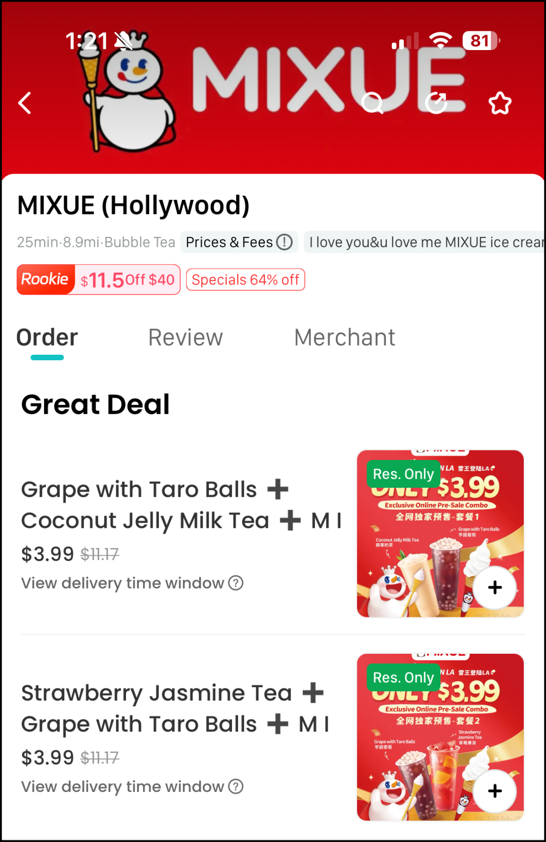 12月15日,位于洛杉磯名為“MIXUE(Hollywood)”的商家已上架2款預(yù)售套餐,取餐時(shí)間為12月19日至12月21日。‘