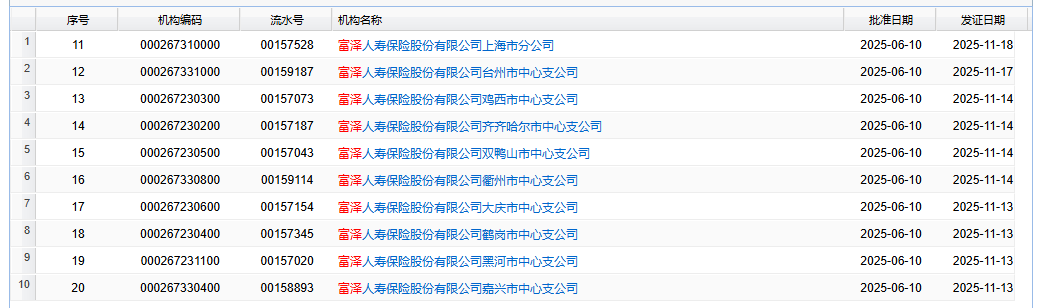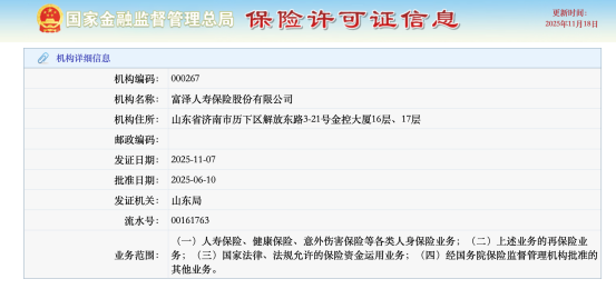 在此之前的11月10日,金融監(jiān)管總局官網(wǎng)也已公布了富澤人壽于今年6月10日獲準(zhǔn)的保險(xiǎn)許可證信息。