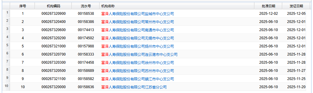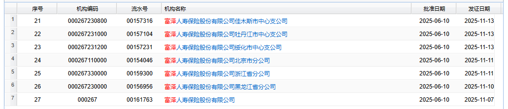 除了總公司保險(xiǎn)許可證下發(fā),監(jiān)管官網(wǎng)近日也陸續(xù)發(fā)布了該公司各分支機(jī)構(gòu)保險(xiǎn)許可證相關(guān)信息。