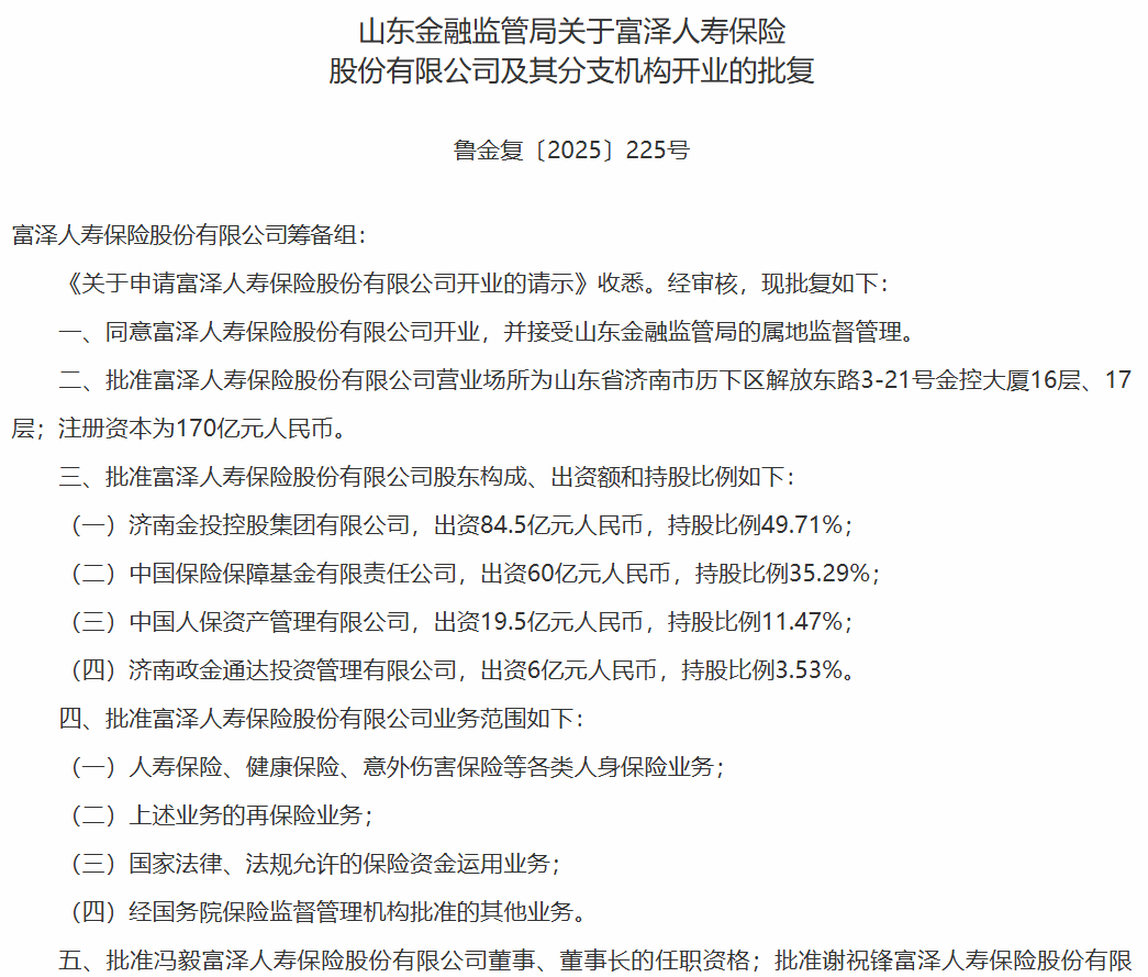 據(jù)觀潮財(cái)經(jīng)了解,富澤人壽在今年年初獲監(jiān)管批籌;6月19日富澤人壽完成工商注冊(cè)登記,注冊(cè)資本170億元,其也于當(dāng)月獲批開(kāi)業(yè)。根據(jù)最新信息來(lái)看,其股權(quán)結(jié)構(gòu)呈現(xiàn)“地方國(guó)資+行業(yè)保障基金+大型險(xiǎn)企”并行的形式。