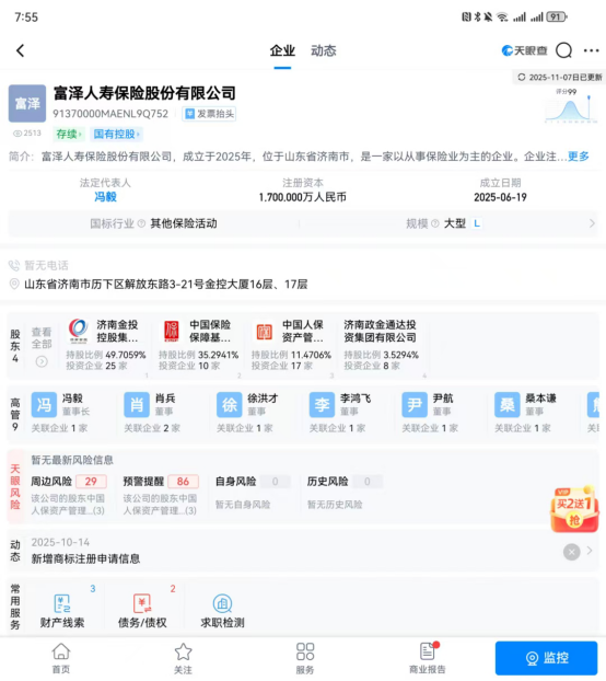 近期,富澤人壽的工商登記信息也已更新,其公司地址、股東信息、9名主要高管成員信息均已公開(kāi),顯示其成立日期為2025年6月19日。
