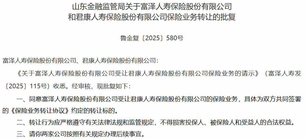 今日,山東金融監(jiān)管局發(fā)布公告,同意富澤人壽受讓君康人壽保險(xiǎn)業(yè)務(wù),這標(biāo)志著君康人壽風(fēng)險(xiǎn)處置正式收官。此外,監(jiān)管官網(wǎng)還同時(shí)公布了富澤人壽獲批籌建、開(kāi)業(yè)、董監(jiān)高獲批等多份文件。