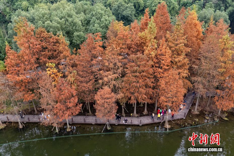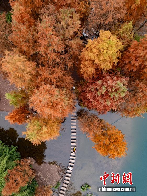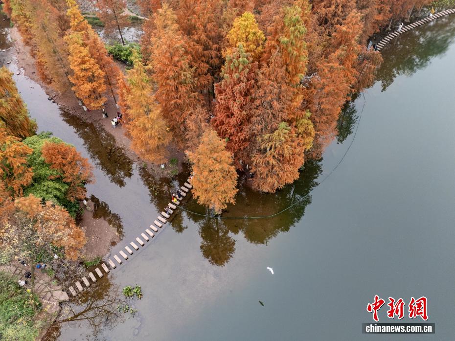 12月16日,民眾在重慶彩云湖國家濕地公園的水杉林游玩。近日,位于重慶九龍坡區的彩云湖國家濕地公園內,成片的水杉逐漸披上“紅裝”,色彩斑斕,吸引不少市民游客前來觀賞拍照,感受城市濕地的冬日之美。(無人機照片)