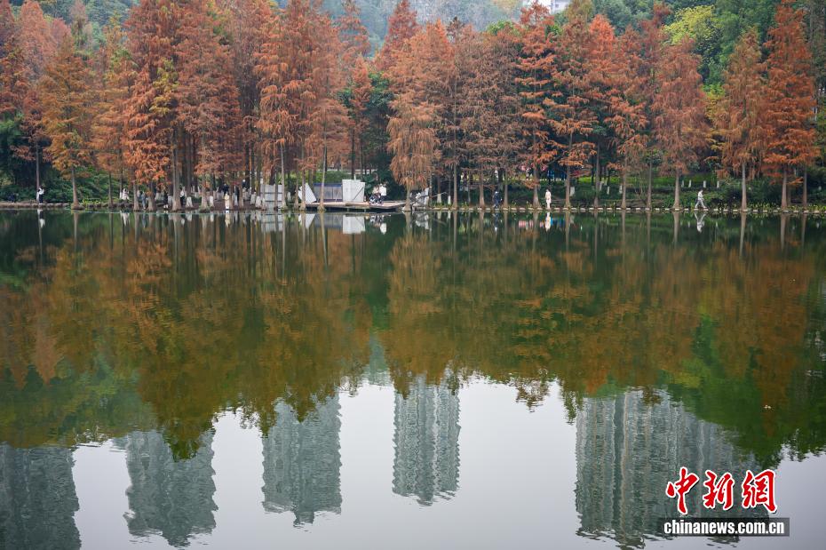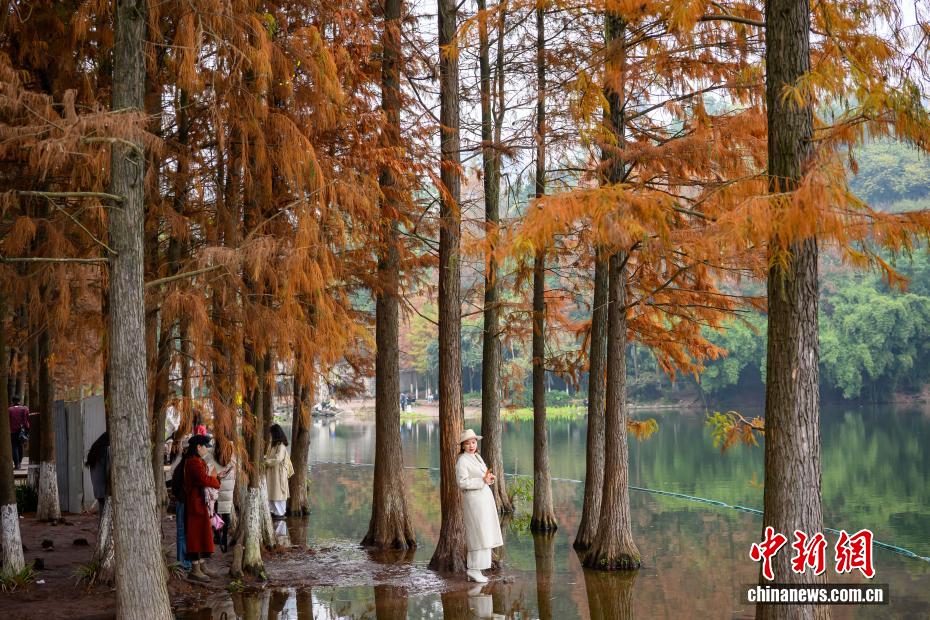 12月16日,民眾在重慶彩云湖國家濕地公園的水杉林游玩。近日,位于重慶九龍坡區的彩云湖國家濕地公園內,成片的水杉逐漸披上“紅裝”,色彩斑斕,吸引不少市民游客前來觀賞拍照,感受城市濕地的冬日之美。