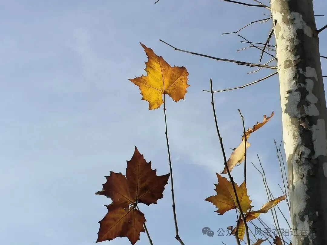 周末,喜歡到江邊走走。幾枚法國梧桐葉,執(zhí)拗地掛在光禿禿的細(xì)枝上,還凝著秋末的余溫,最頂端的那片被日光鍍上一層亮黃,像一只翩飛的蝶。枝干早褪盡了繁葉,疏朗的枝椏襯得這幾片葉子愈發(fā)孤挺,它們蜷著邊緣,卻依舊撐著掌狀的輪廓,在冷冽的風(fēng)里,成了冬日晴空下最鮮活的點綴。