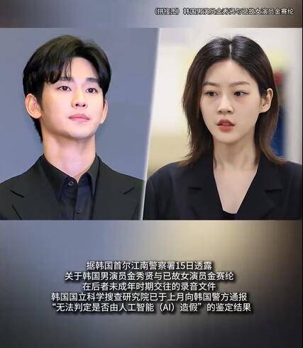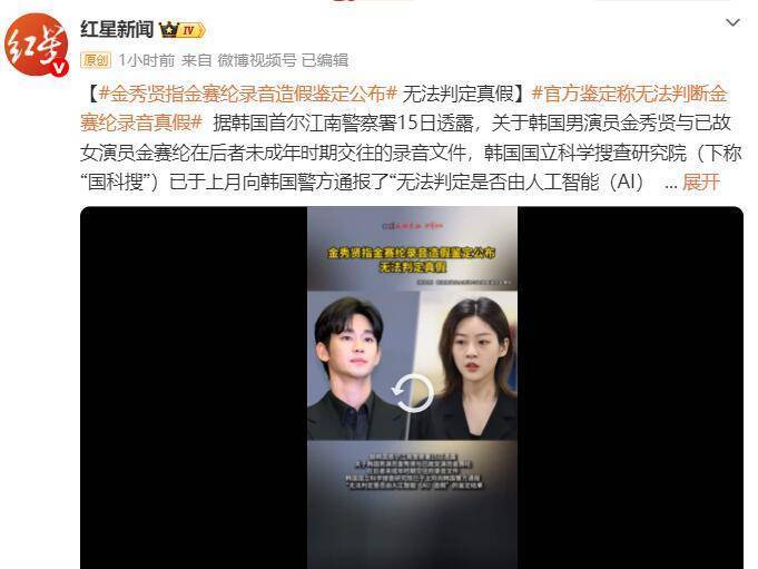 (來源:紅星新聞)據韓國首爾江南警察署15日透露,關于韓國男演員金秀賢與已故女演員金賽綸在后者未成年時期交往的錄音文件,韓國國立科學搜查研究院(下稱“國科搜”)已于上月向韓國警方通報了“無法判定是否由人工智能(AI)造假”的鑒定結果。據此前報道,今年5月,“橫豎研究所”的運營者金世義與金賽綸遺屬方面的法律代理人召開記者會,公開了一段“極具沖擊力”的錄音。兩人主張,錄音內容證實了金秀賢在金賽綸未成年時期就與其交往。