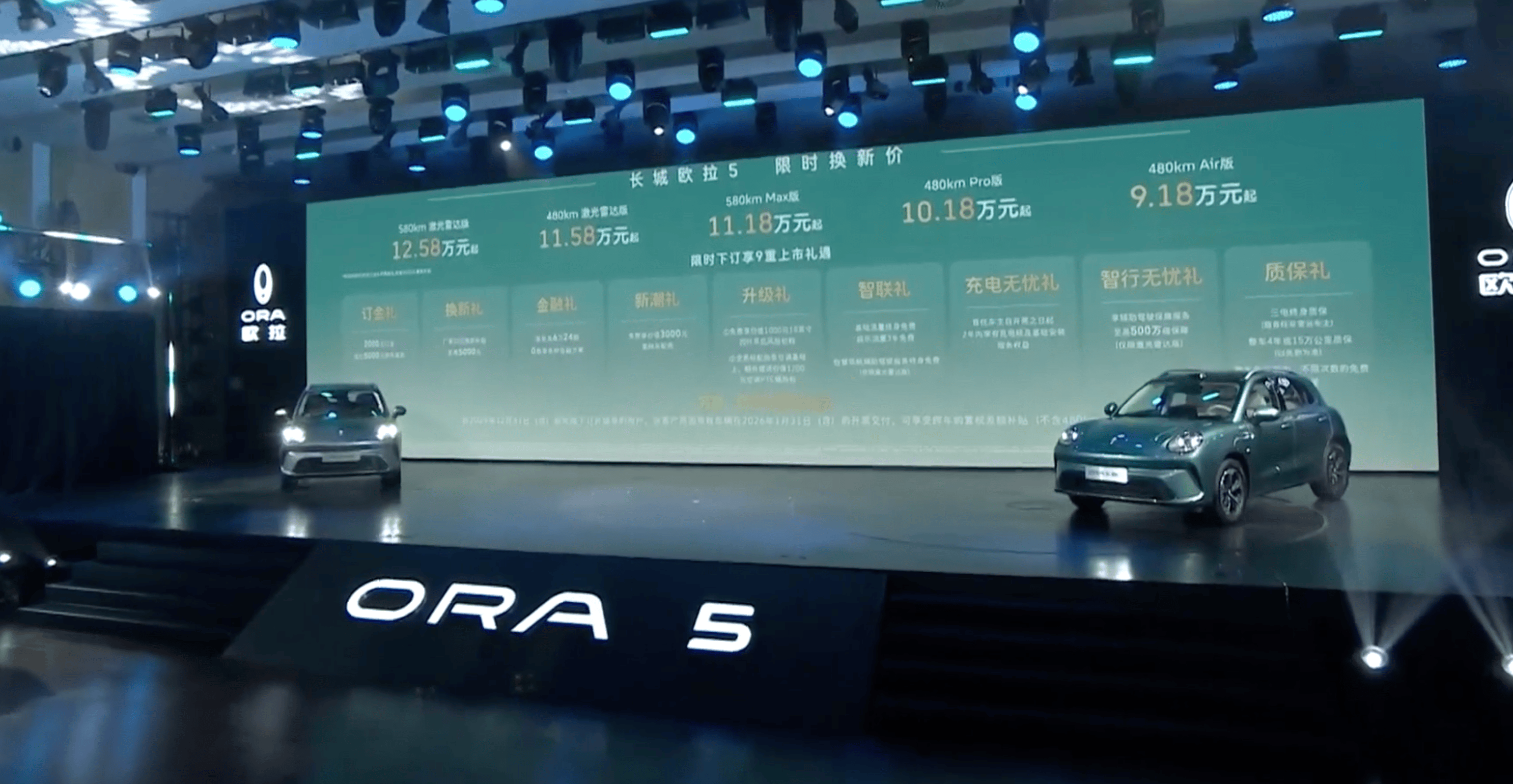 2025年12月16日,長城歐拉5正式上市,新車推出5個車款,官方指導價區間為9.98-13.38萬元,同時疊加限時優惠方案,上市限時權益價9.18-12.58萬元起。該車延續了歐拉“貓”系列車型的設計,最高續航可達580km。搭載第三代Coffee Pilot Ultra輔助駕駛系統,擁有激光雷達等27個感知硬件,可實現不依賴高精地圖的全場景NOA,同時支持跨樓層記憶泊車等200多種泊車場景。