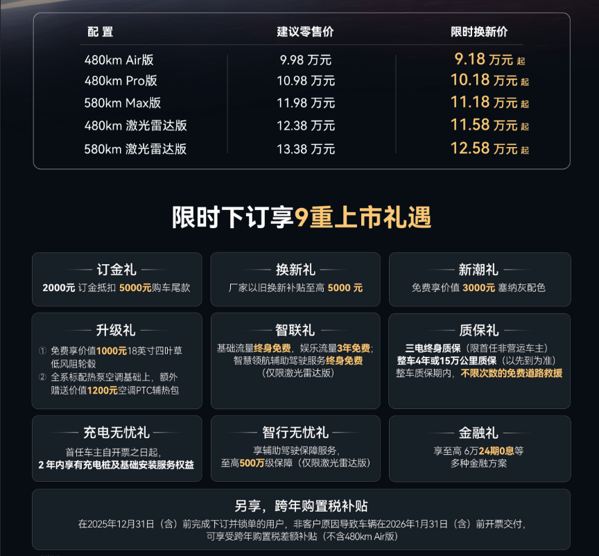 動力方面,新車搭載最大功率150kW的電機,搭配蜂巢能源磷酸鐵鋰短刀動力電池,提供45.3kWh和58.3kWh兩種電池,對應續航里程分別為480km和580km。