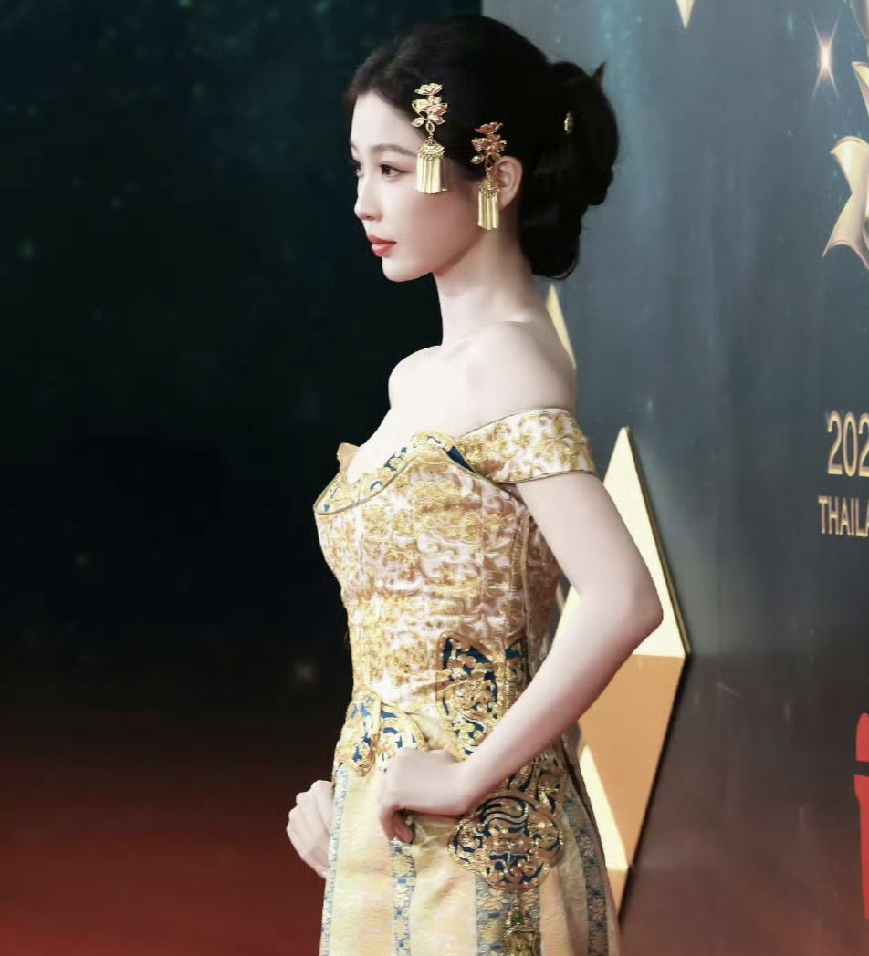 她身著金色系長裙,搭配華麗發飾與珠寶,整體呈現“復古油畫風”,被粉絲形容為“油畫里走出的女王”。部分觀眾認為發飾設計“夢回《云之羽》云為衫角色”。紅毯生圖獲多平臺認證賬號稱贊“狀態滿分”“閃耀泰蘭德”,粉絲密集發布“美顏暴擊”“女神級別”等感嘆。