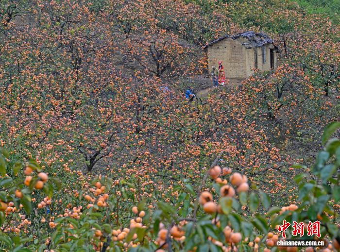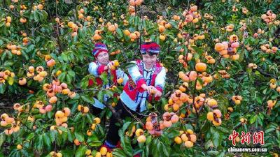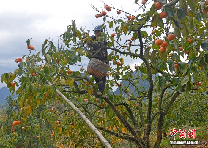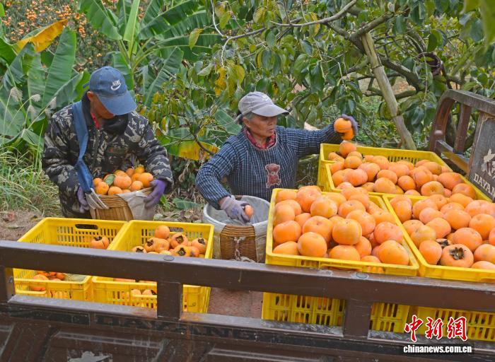 圖為柿農在采收柿子。滕忠 攝