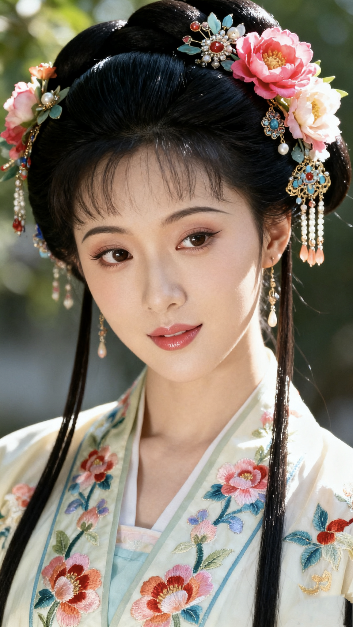 發(fā)髻的打造遵循古典盤發(fā)的章法,烏黑的發(fā)絲被梳得光整柔亮,挽成飽滿的圓髻,額前的碎發(fā)修剪成纖細的流蘇劉海,既保留了古典仕女的溫婉輪廓,又添了幾分靈動的少女氣。這種發(fā)式并非憑空設計,而是借鑒了宋明時期的女子發(fā)式特點,簡約卻不失精致,讓頭部的視覺重心自然落在飾品與面容的搭配上。