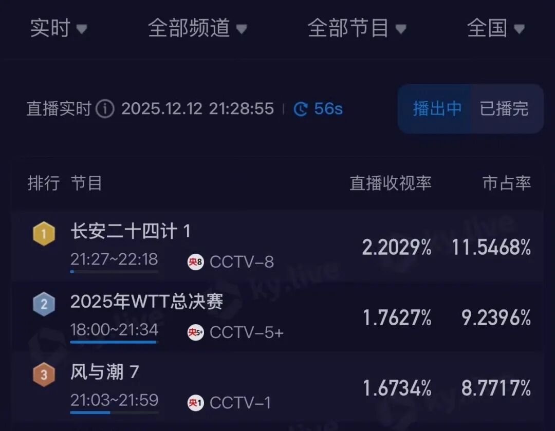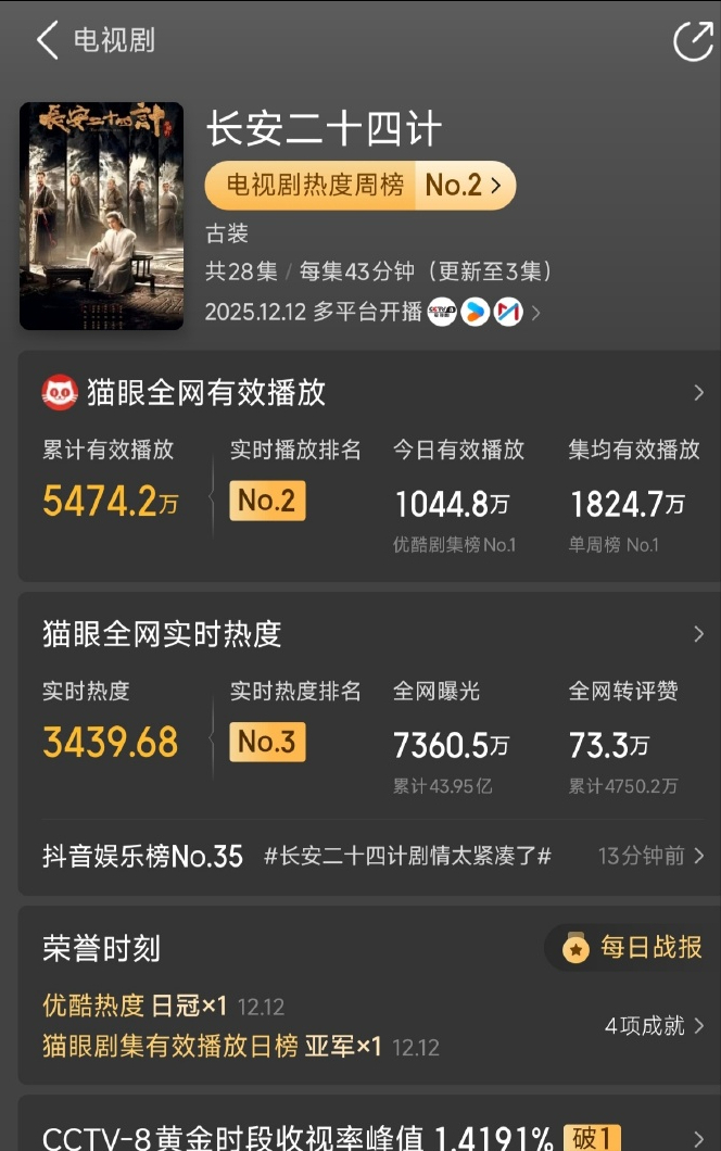 《即刻上場》黯然收官,而接檔的《長安二十四計》開播便封神。央視八套首播收視率突破2%,市場份額高達11.6633%,輕松拿下同時段全國第1,拉升了次黃金檔的收視率。