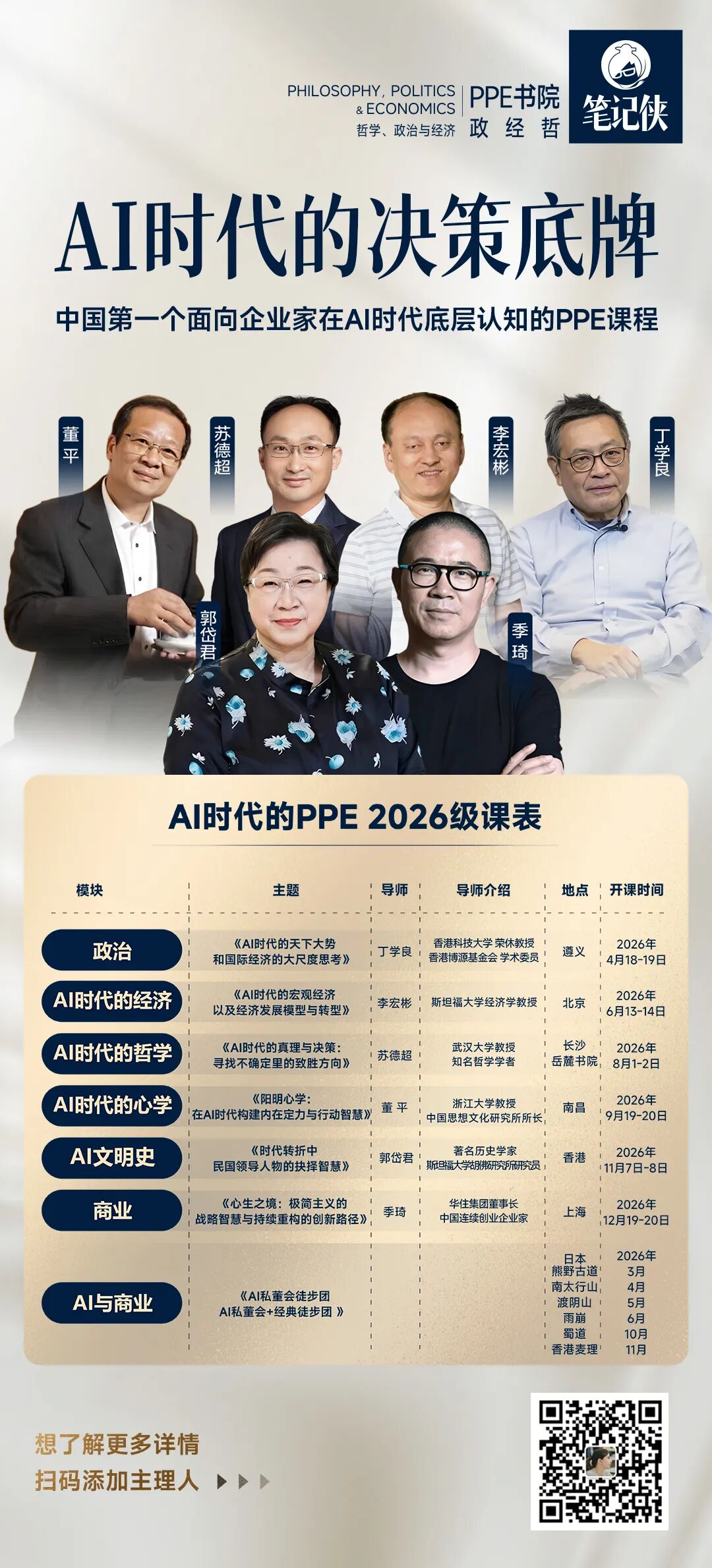 而AI時代的PPE(政經哲)的存在,其價值是讓大家從更底層的角度,包括計算機科學、AI文明、經濟學、政治學、哲學、前沿科技等視角,去看AI時代,不被 AI 層出不窮的迭代嚇到。