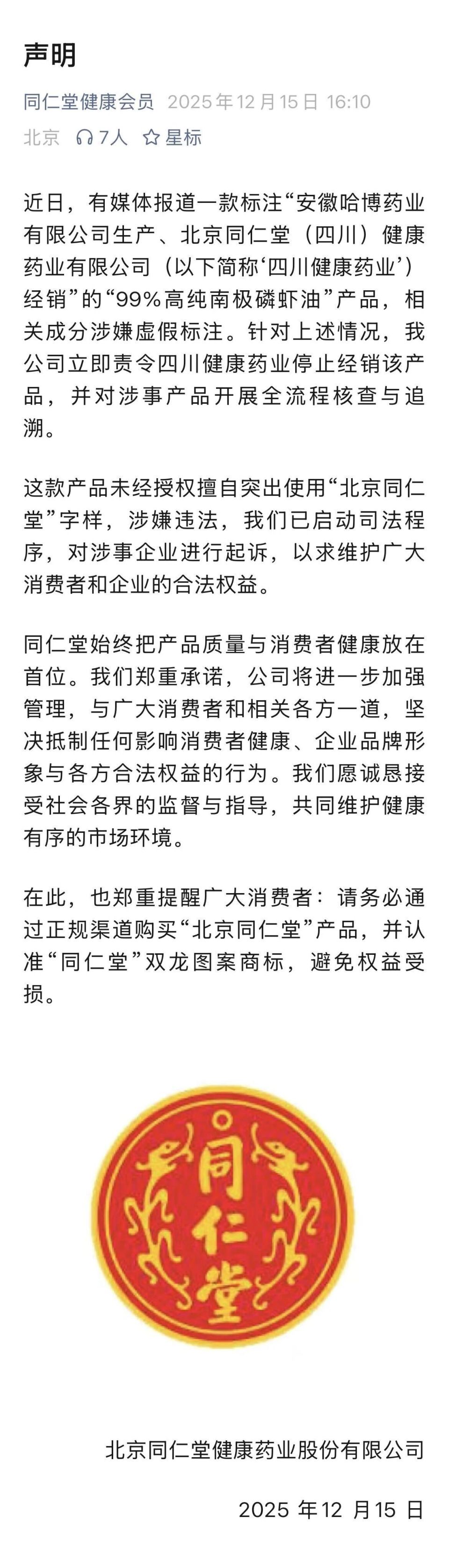 面對輿論發酵,12月15日,北京同仁堂健康藥業股份有限公司發布聲明,責令四川健康藥業停止經銷該產品,并對涉事產品開展全流程核查與追溯。聲明稱,這款產品“未經授權擅自突出使用‘北京同仁堂’字樣,涉嫌違法”,公司已啟動司法程序,對涉事企業進行起訴。