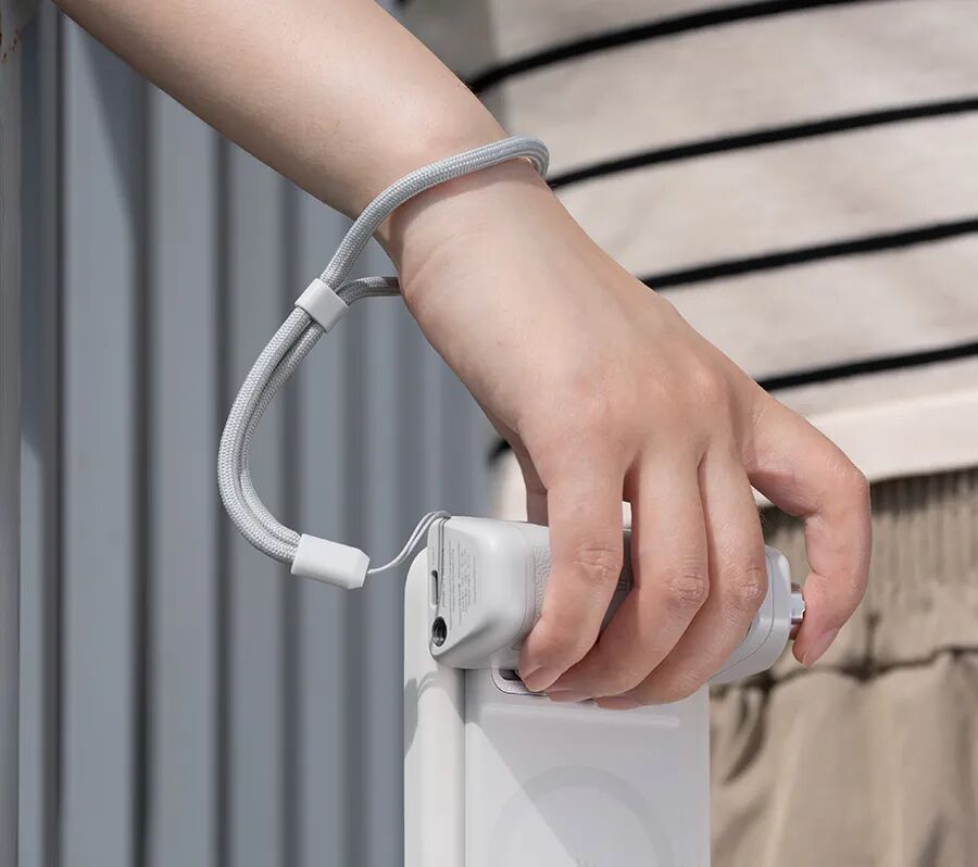 這條編織線既是充電線,也是一個可調節的便攜提手。線材可通過滑動機身側的收線結構進行長度調節與固定。