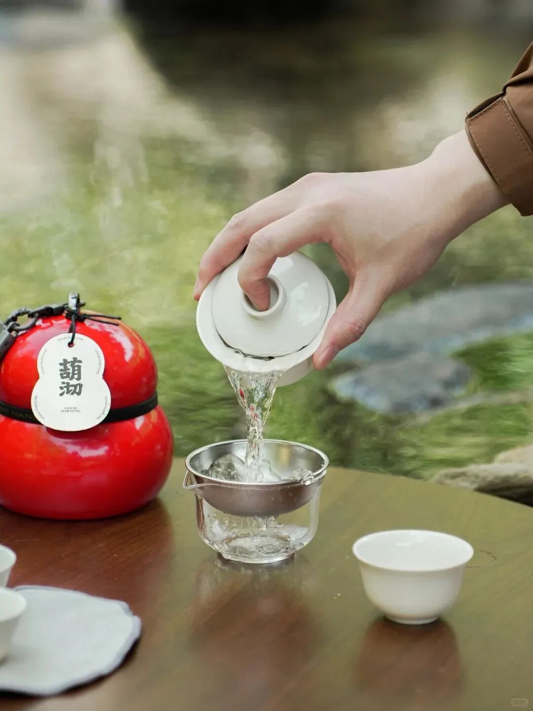 打開后更有意思:葫蘆上半截是茶壺,下半截反過來就是個接廢水的茶盤,立馬就能開喝了。