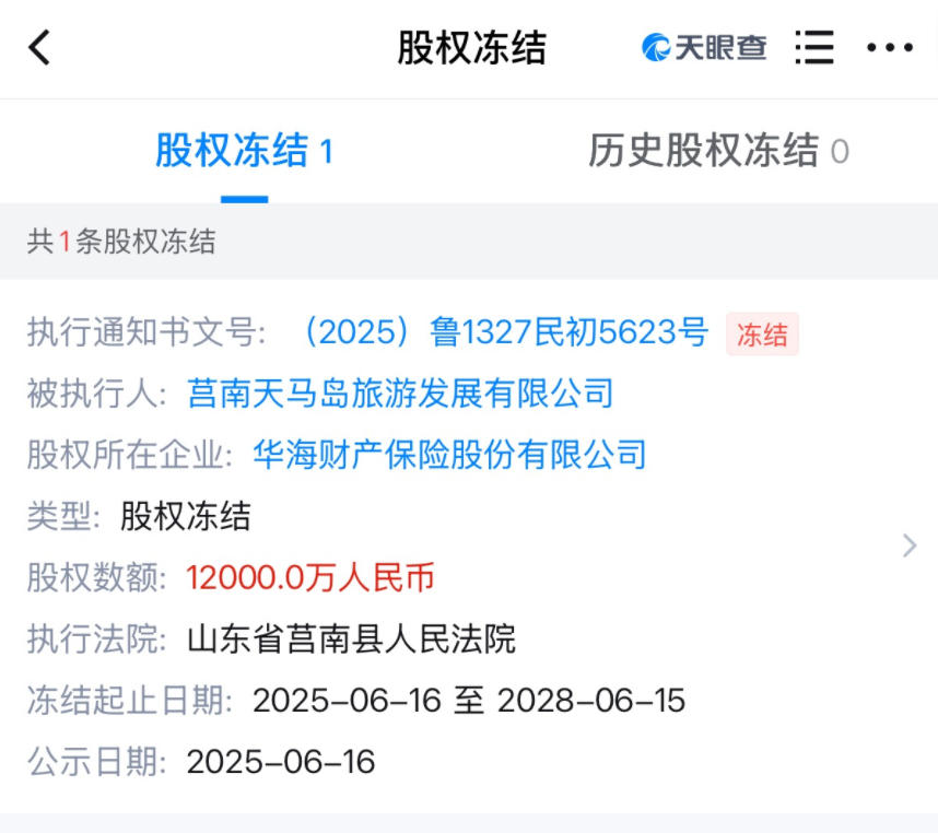 不僅如此,華海財(cái)險(xiǎn)并列第二大股東莒南天馬島所持全部10%股權(quán)亦遭到司法凍結(jié)。天眼查顯示,執(zhí)行法院為山東省莒南縣人民法院,凍結(jié)日期為2025年6月16日至2028年6月15日。