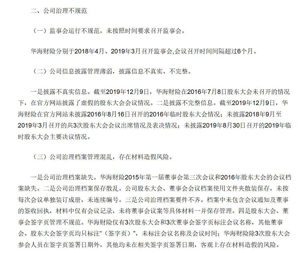 但這場會議在后來被監(jiān)管認(rèn)定并未實(shí)際召開,而是“虛假”的。2020年底,銀保監(jiān)會披露對華海財(cái)險(xiǎn)的行政處罰決定書(銀保監(jiān)罰決字〔2020〕65號),華海財(cái)險(xiǎn)因向監(jiān)管部門提供虛假資料、公司治理不規(guī)范等被合計(jì)罰款51萬元,該公司董事長趙小鳴被警告并罰款10萬元。此外,經(jīng)查,華海財(cái)險(xiǎn)在2016年7月8日股東大會未召開的情況下,在官方網(wǎng)站披露了虛假的股東大會會議情況。
