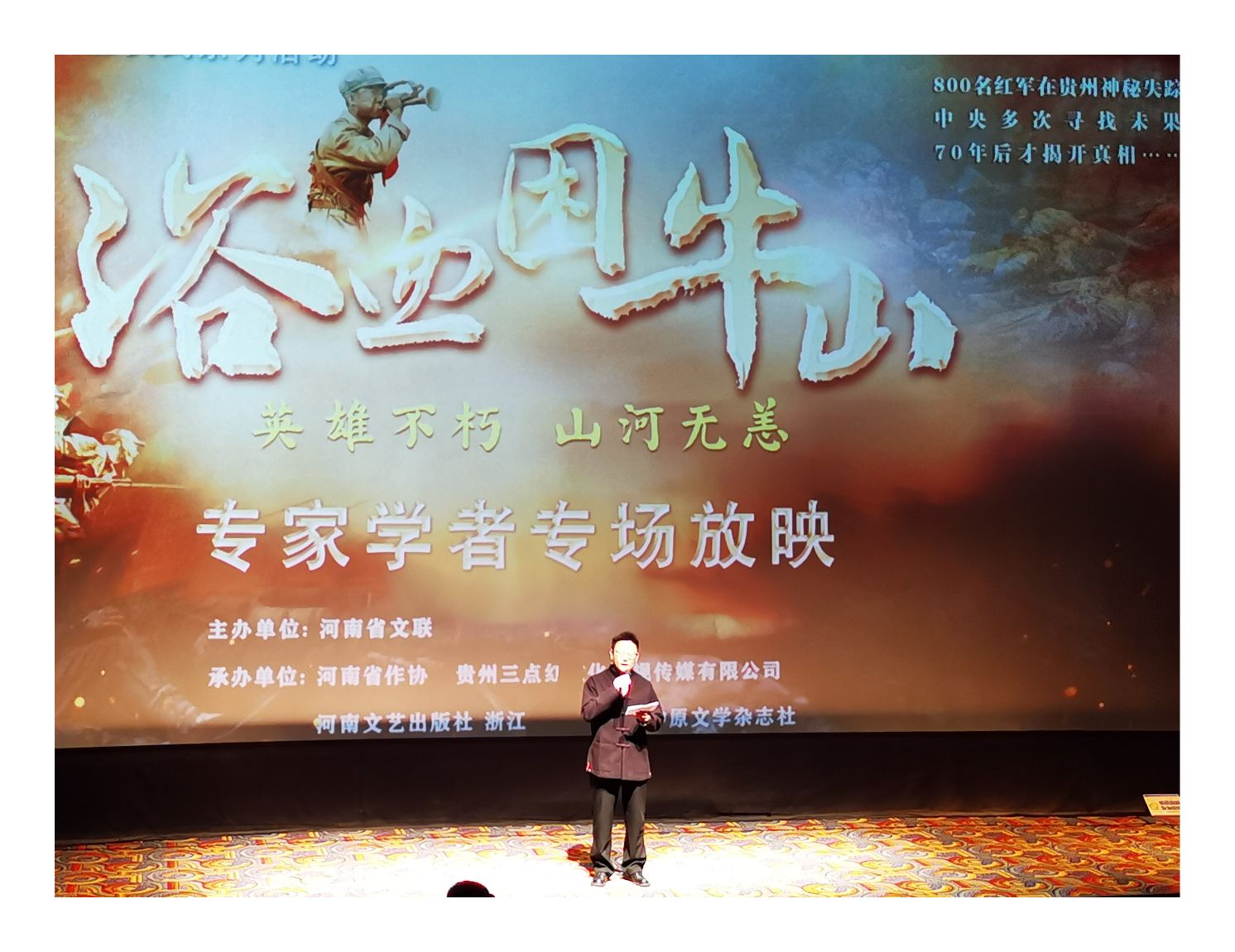 今天上午,由河南省文聯主辦,河南省作家協會、貴州三點紅文化影視傳媒有限公司等承辦的電影《浴血困牛山》專家學者專場放映,在鄭州奧斯卡影城隆重舉行,我們嵩岳詩社11名社員以詩人身份參加其中。影片再現了當年紅六軍團和所屬十八師52團史詩般的偉大壯舉,劇情波瀾壯闊、氣勢恢宏,我深深為當年紅軍驚天地、泣鬼神的英雄事跡所震撼、所刺痛、所感動,激動心情難以平靜,如泉熱淚流個不停。今作詩【七絕三首·泣觀《浴血困牛山》】,謹以緬懷和致敬民族脊梁英雄先烈們,為繼承他們遺志、賡續他們精神、振興中華民族、實現民族復興盡綿薄之力。并述己懷記之,與友共勉之。如是 :