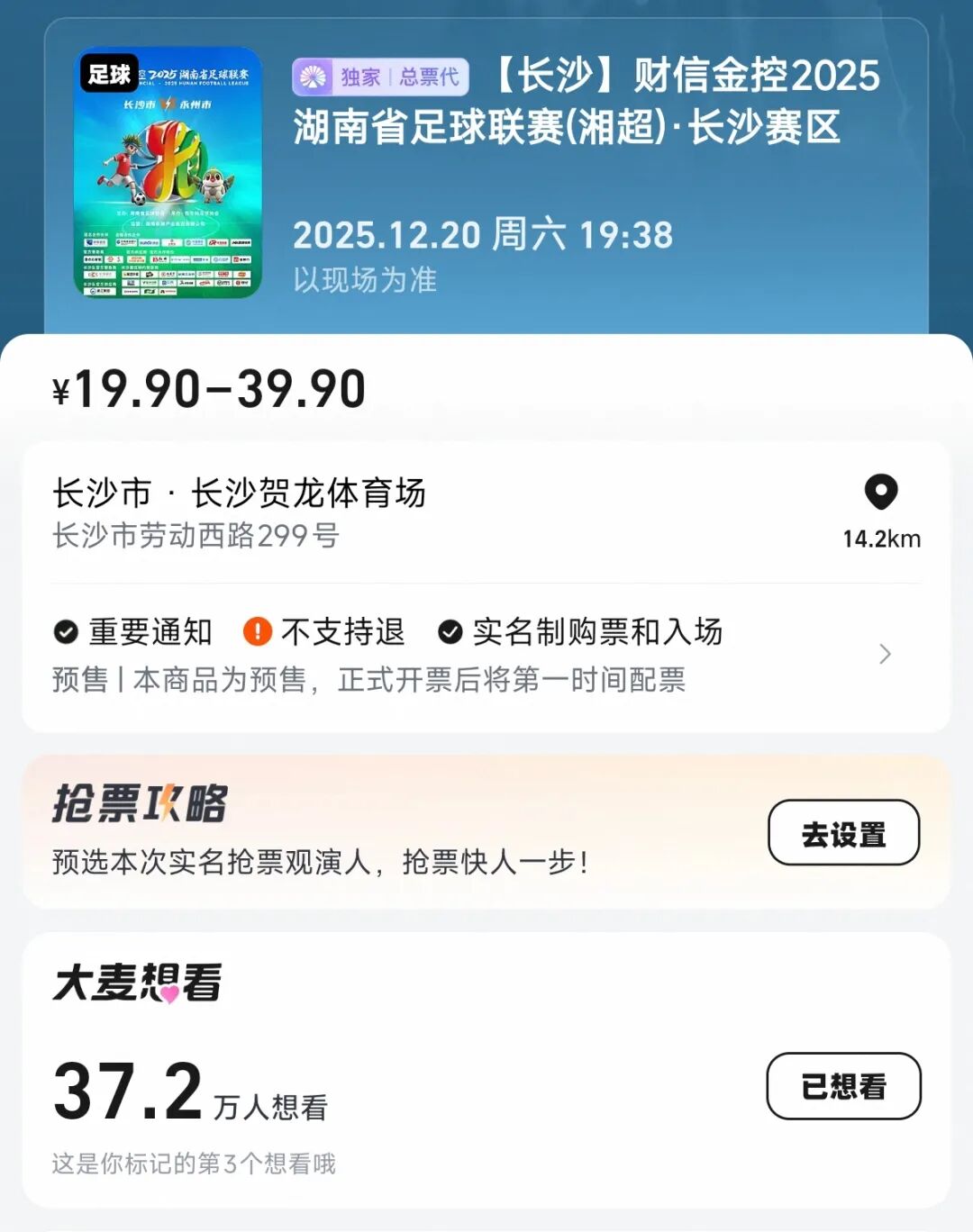 賀龍體育場的燈光已為榮耀點亮,湘超半決賽即將上演!長沙隊主場迎戰永州隊,大麥平臺已開啟票務預約,截至發稿已經吸引超過37萬人圍觀。
