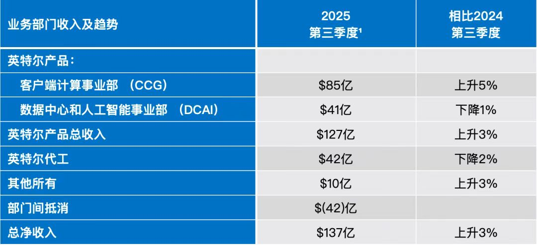 最新財報數(shù)據(jù)顯示,2025年第三季度,英特爾實現(xiàn)營收137億美元,同比增長3%。分業(yè)務(wù)來看,公司客戶計算業(yè)務(wù)(CCG)實現(xiàn)營收85億美元,同比增長5%;數(shù)據(jù)中心和人工智能(DCAI)實現(xiàn)營收41億美元,同比下降1%;代工業(yè)務(wù)實現(xiàn)營收42億美元,同比下降2%。