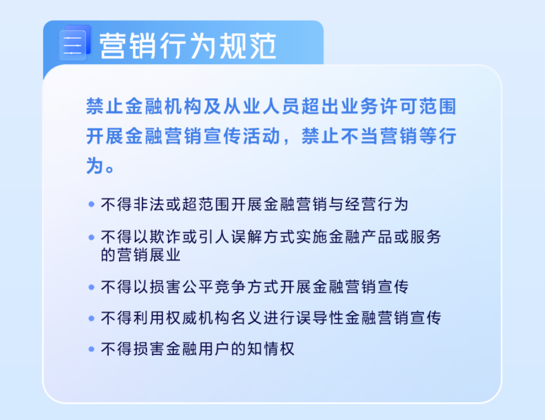 考慮到金融行業特定屬性,《公約》對營銷行為作出嚴格約束。《公約》要求金融機構及從業人員需具備合法資質并完成平臺認證方可開展營銷宣傳活動,嚴禁非法或超范圍經營;禁止以欺詐、引人誤解的方式進行營銷,明確不得虛假承諾收益、隱瞞限制條件;同時禁止通過不當評比、排序等方式進行宣傳,不得利用權威機構名義進行誤導性金融營銷;強調營銷過程需充分保障用戶知情權,對風險信息進行顯著提示。