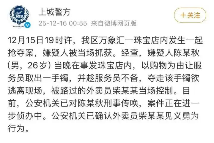 12月16日凌晨,杭州市公安局上城分局官方微博通報: