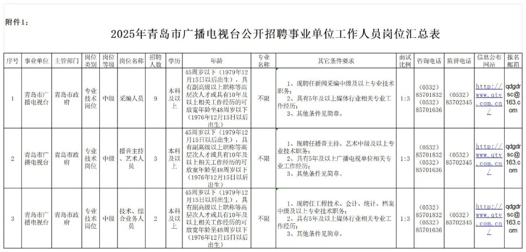詳見《2025年青島市廣播電視臺公開招聘事業單位工作人員崗位匯總表》(見附件1)。對工作經歷年限的要求,按足年足月計算到報名開始之日。