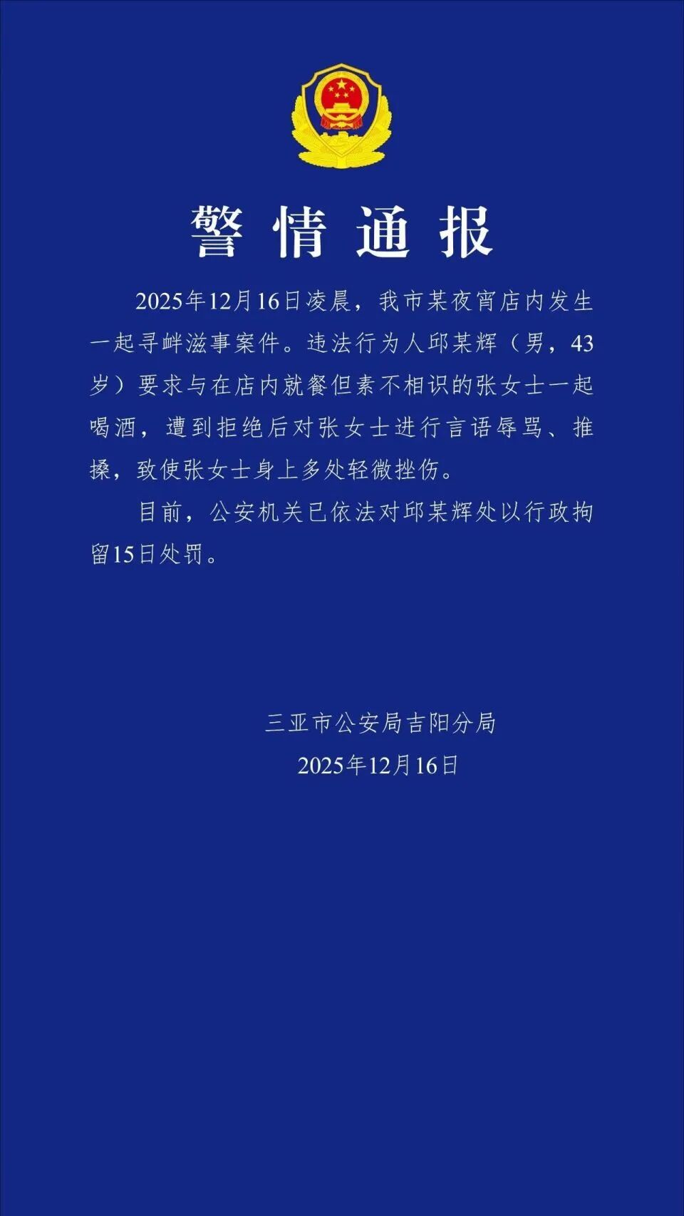 2025年12月16日凌晨,我市某夜宵店內發生一起尋釁滋事案件。違法行為人邱某輝(男,43歲)要求與在店內就餐但素不相識的張女士一起喝酒,遭到拒絕后對張女士進行言語辱罵、推搡,致使張女士身上多處輕微挫傷。