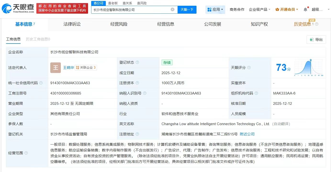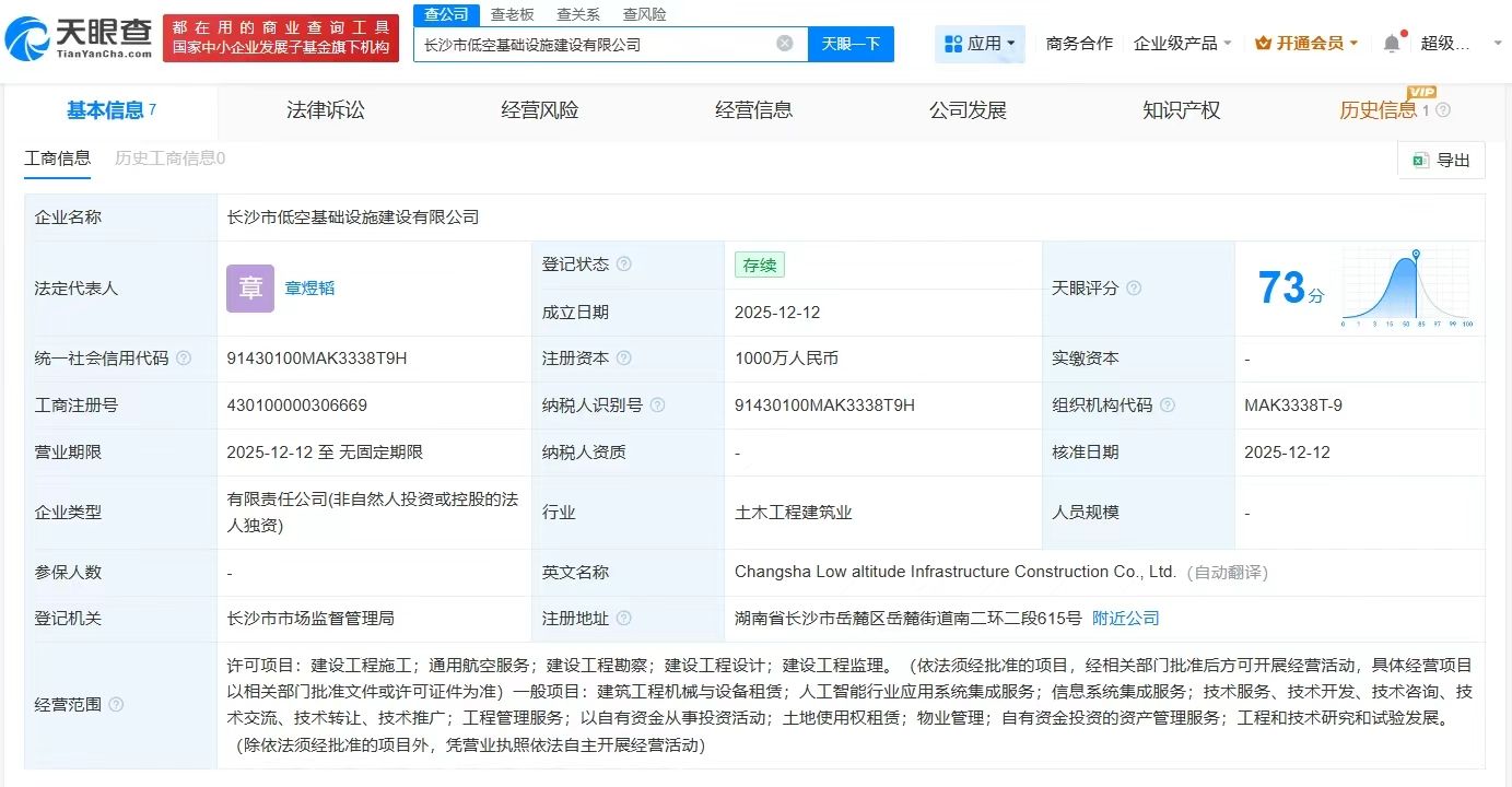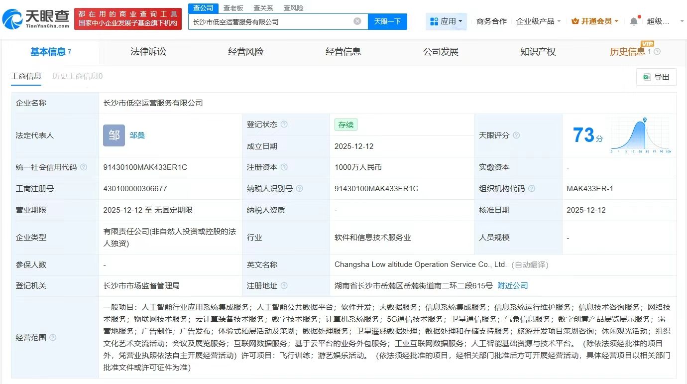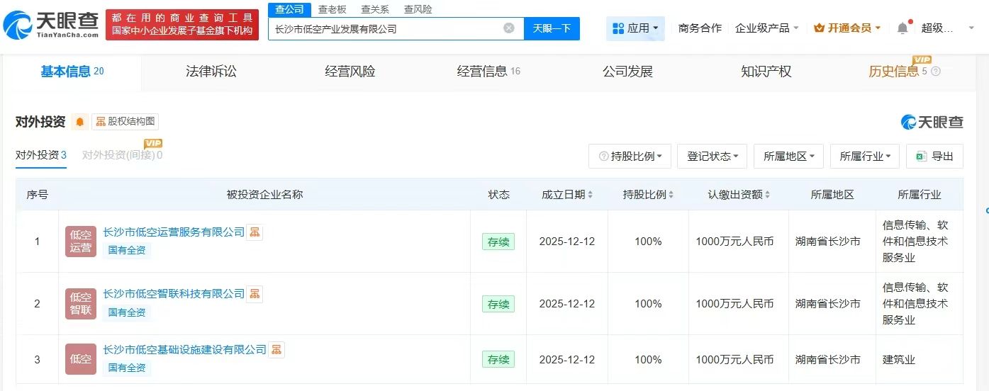 天眼查App顯示,近日,長沙市低空運營服務有限公司、長沙市低空智聯科技有限公司、長沙市低空基礎設施建設有限公司成立,法定代表人分別為鄒桑、王曉華、章煜韜,注冊資本均為1000萬人民幣。股東信息顯示,上述公司均由長沙市低空產業發展有限公司全資持股。