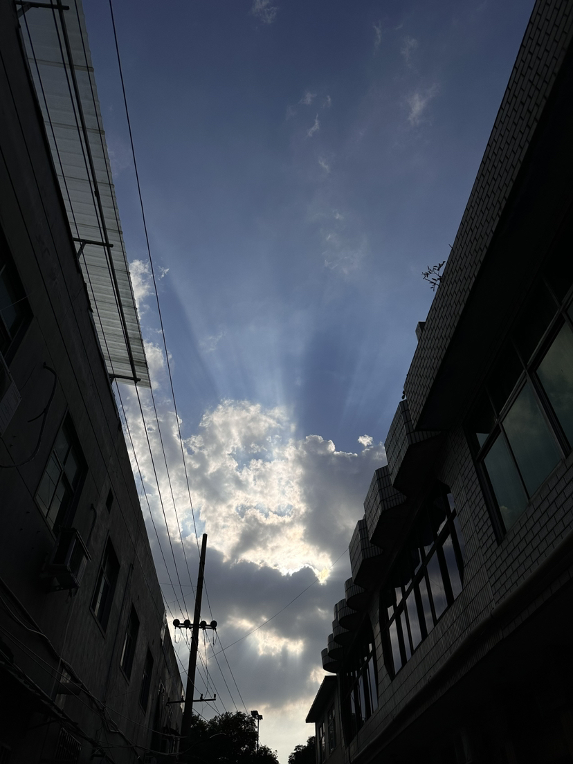 巷子里,兩邊的樓把天空擠成窄窄一條,結果陽光偏從云縫里鉆出來,扯出幾道亮閃閃的光帶。灰撲撲的墻瞬間就鮮活了,這突如其來的光影,簡直是平凡巷弄里的小彩蛋。