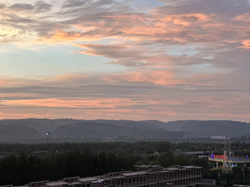 遠山邊,晚霞把天染成了橘子汽水的顏色,粉粉橙橙的云絮飄在山頭,遠處的房子和樹都成了黑糊糊的剪影。風一吹,連帶著這溫柔的光影,都好像在慢慢晃悠。
