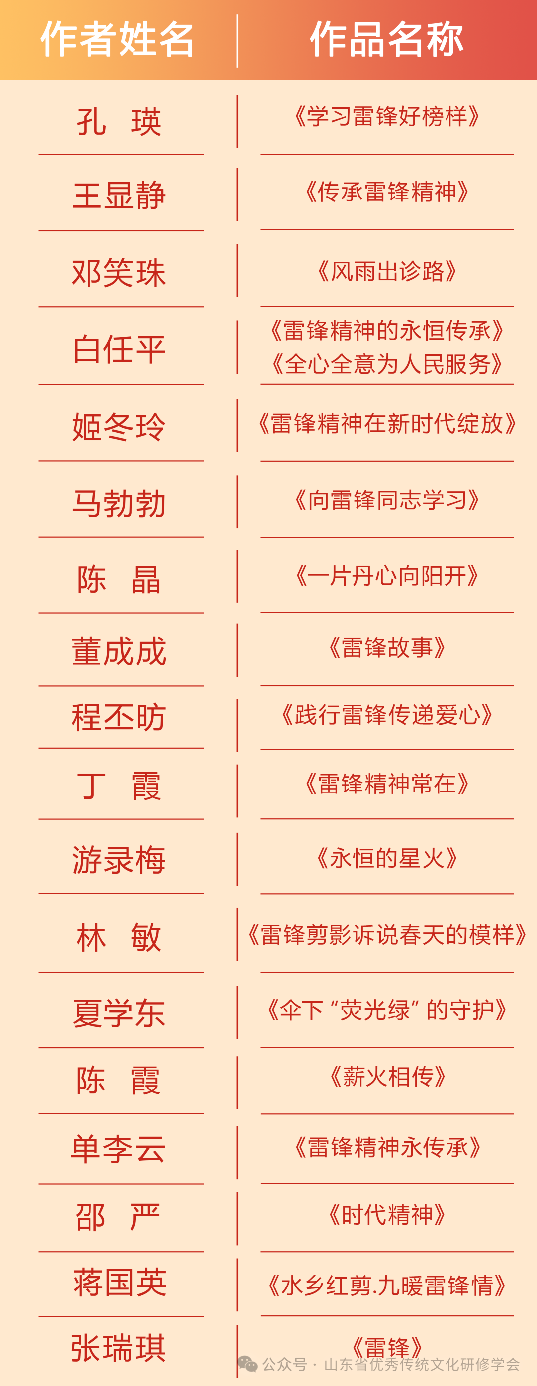 今年是《雷鋒》雜志創刊10周年。為進一步發揮《雷鋒》雜志這一主流媒體弘揚雷鋒精神的引領作用,展示《雷鋒》雜志對社會文明建設的動員組織力、感染號召力,擴大對全社會積極影響力。由《雷鋒》雜志社、山東省優秀傳統文化研修學會、青島黃海學院共同主辦,山東工藝美術學院視覺傳達設計學院、山東省傳統文化教育研究會紅色文化專業委員會、青島市雷鋒精神研究會、膠州市關工委承辦,長沙職業技術學院、半島都市報膠州全媒體中心、膠州市職業教育中心學校、青島膠州市阜安街道辦事處大同中心幼兒園協辦的,學雷鋒樹新風弘揚雷鋒精神《身邊的雷鋒》主題剪紙作品征稿活動,自2025年9月征稿以來,收到作品144幅。通過剪紙藝術生動展現了雷鋒精神和開展學雷鋒活動的成果,形象的表現出雷鋒精神的時代內涵,為剪紙藝術服務于新時代文明實踐開辟了新的路徑。經過專家評審委的嚴格評審,評選出一等獎12件,二等獎19件, 三等獎64件。現將擬獲獎名單予以公布。