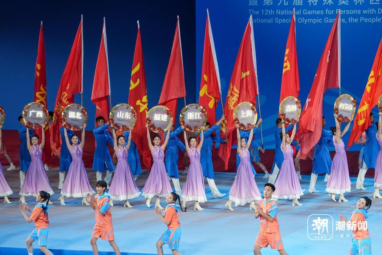 12月15日,全國第十二屆殘疾人運動會暨第九屆特殊奧林匹克運動會正式閉幕,浙江代表團旗幟入場。潮新聞記者 彭鵬 攝