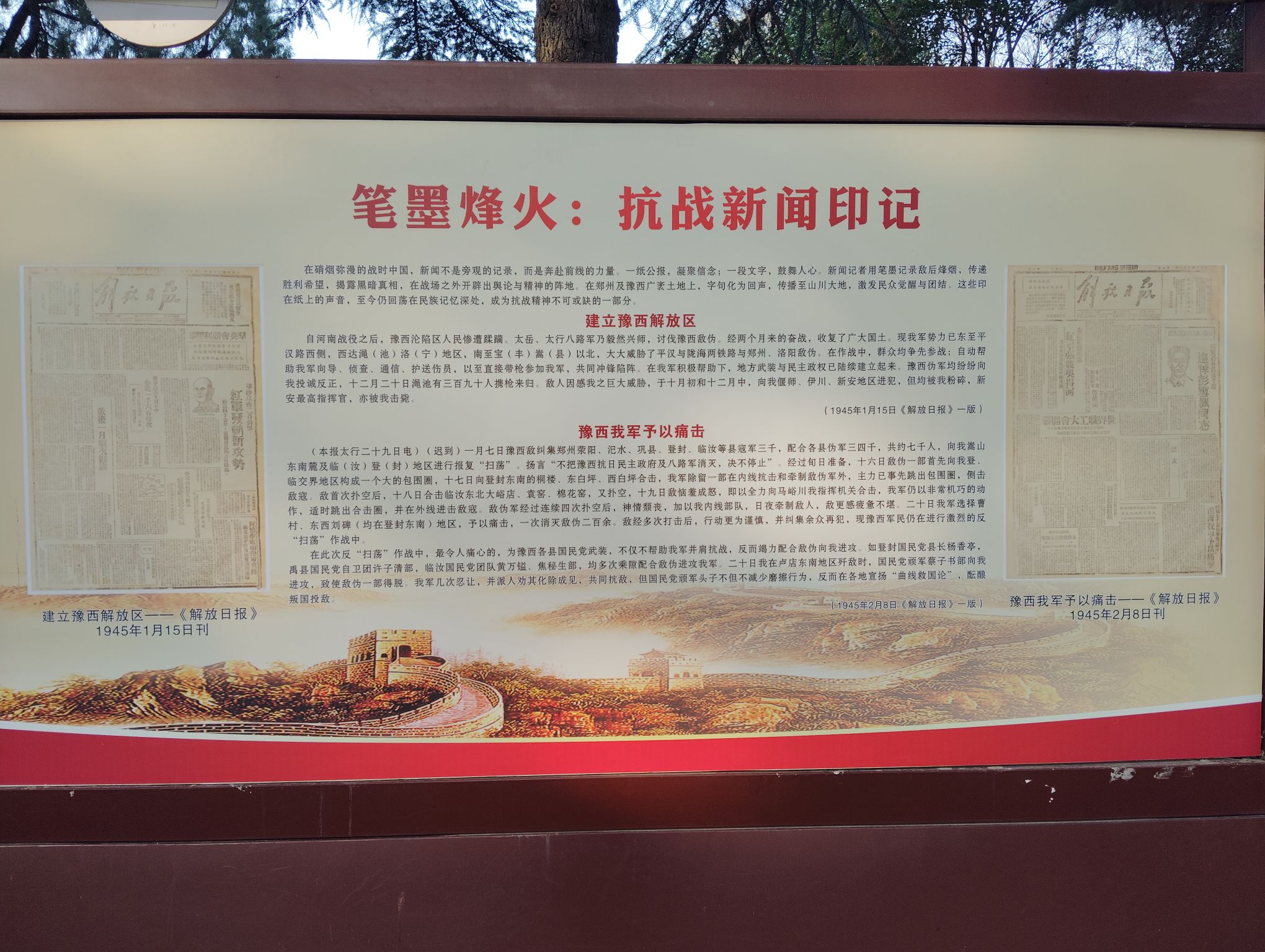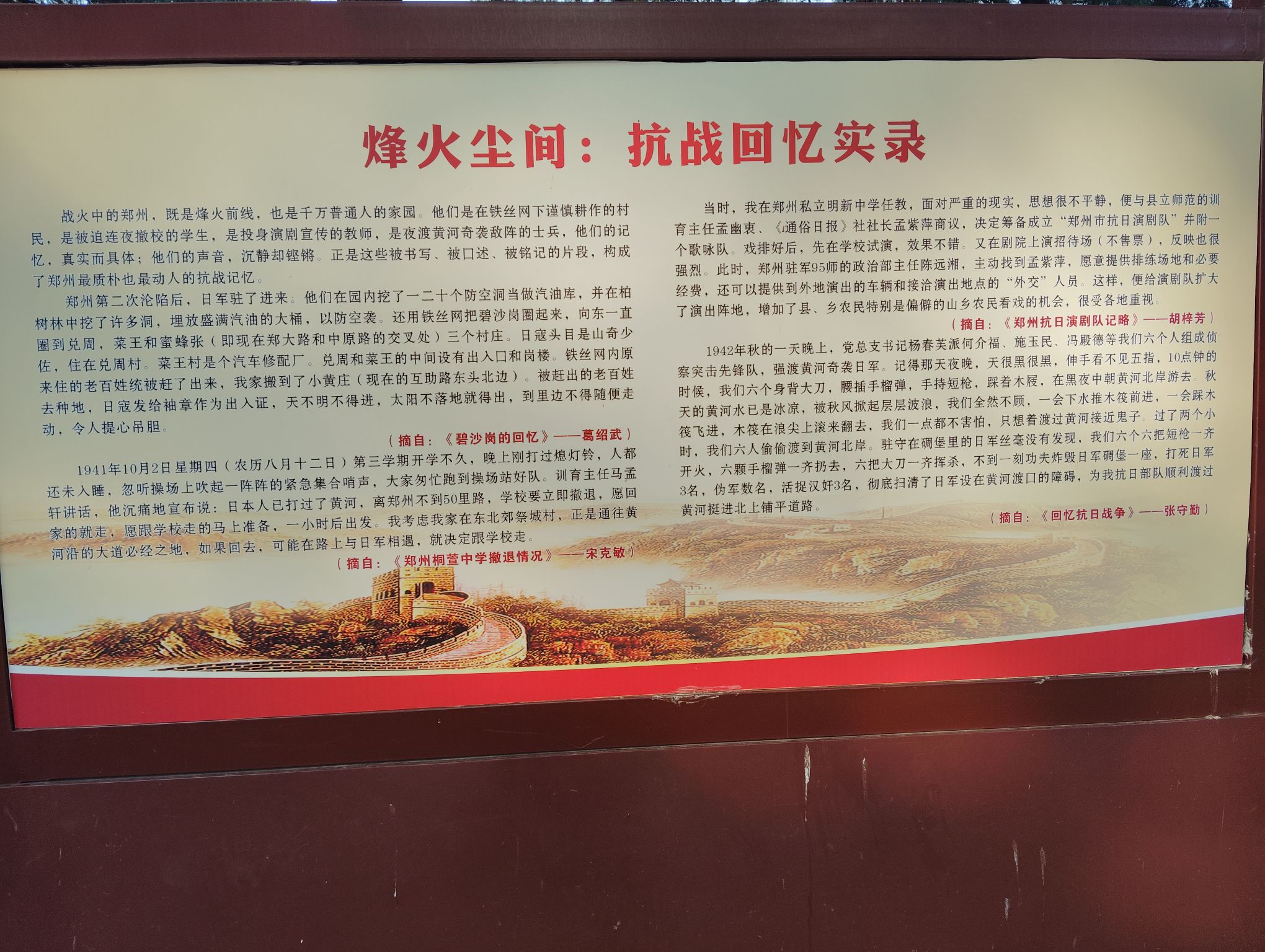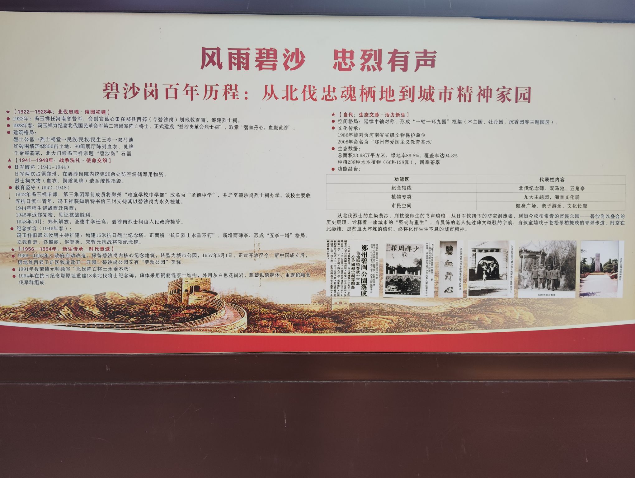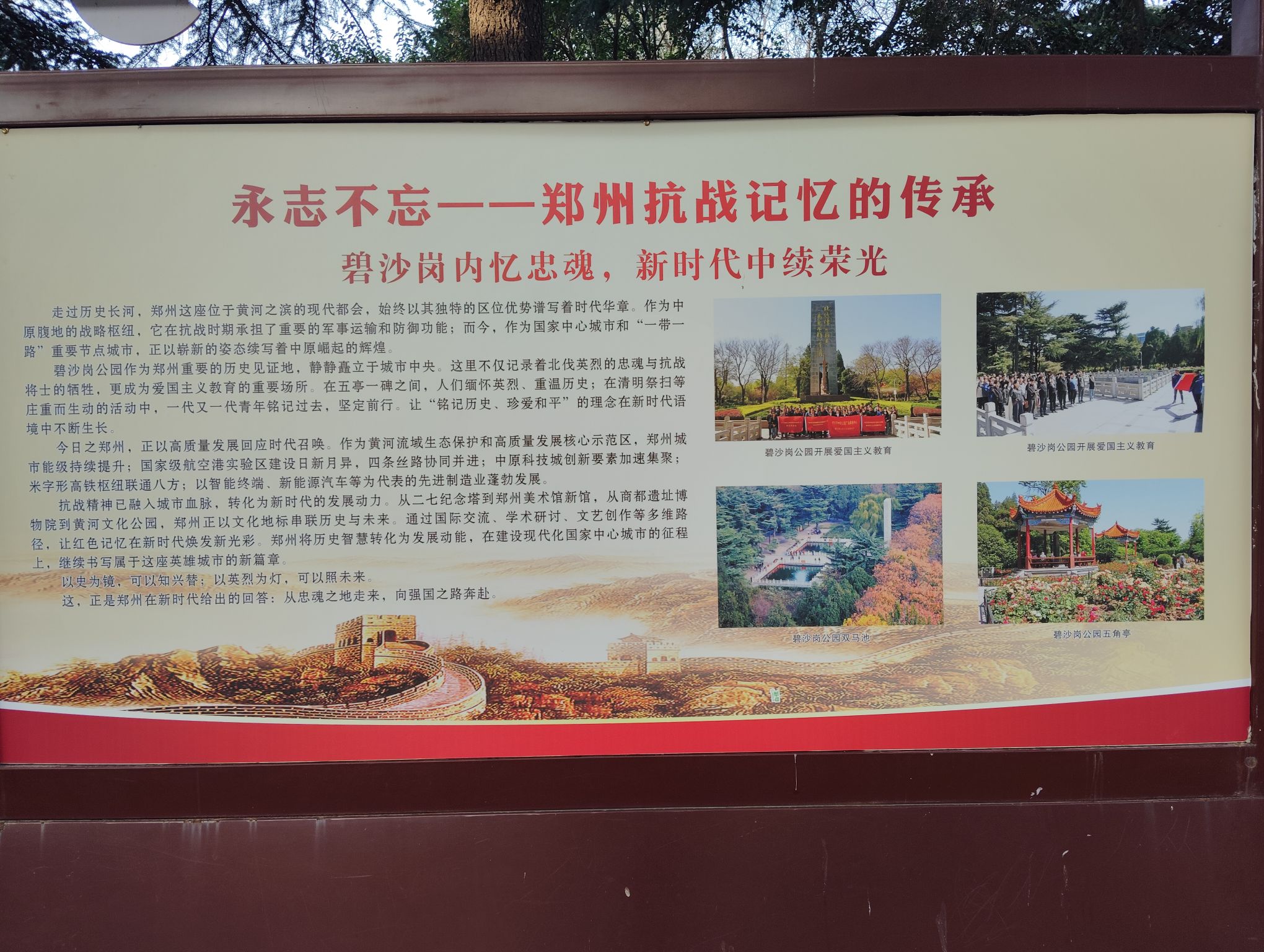 2025年是我國抗戰勝利80周年,在鄭州市愛國主義教育基地——碧沙崗公園的中軸線北端兩側,矗立著十塊展板,分八個模塊展示了鄭州的抗日記憶、抗戰事件記錄、抗戰精神傳承等內容。