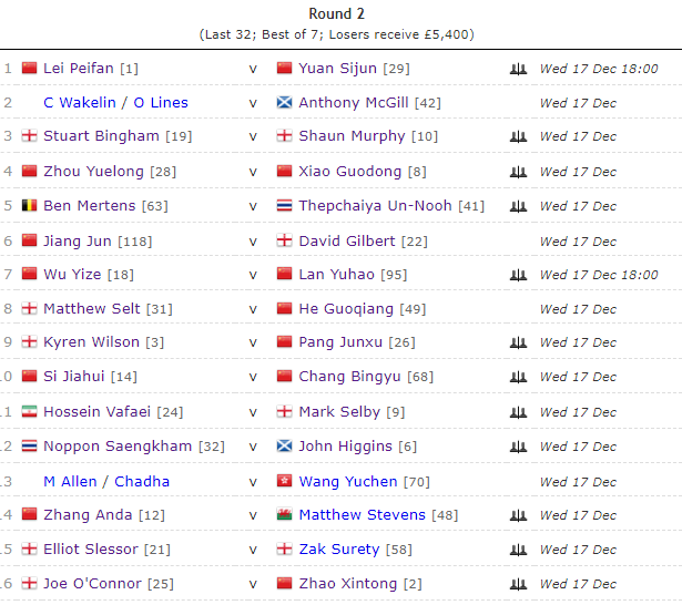 這兩場比賽中,雷佩凡以4-3險勝阿米爾-薩克霍什,吳宜澤以4-0橫掃博伊科。另外,國錦賽冠軍張安達在與歐洲大師賽冠軍范爭一,在的利益上演中國德比戰,達仔以4-1完勝晉級。另外,世錦賽冠軍趙心童、國強因對手退賽自動晉級。